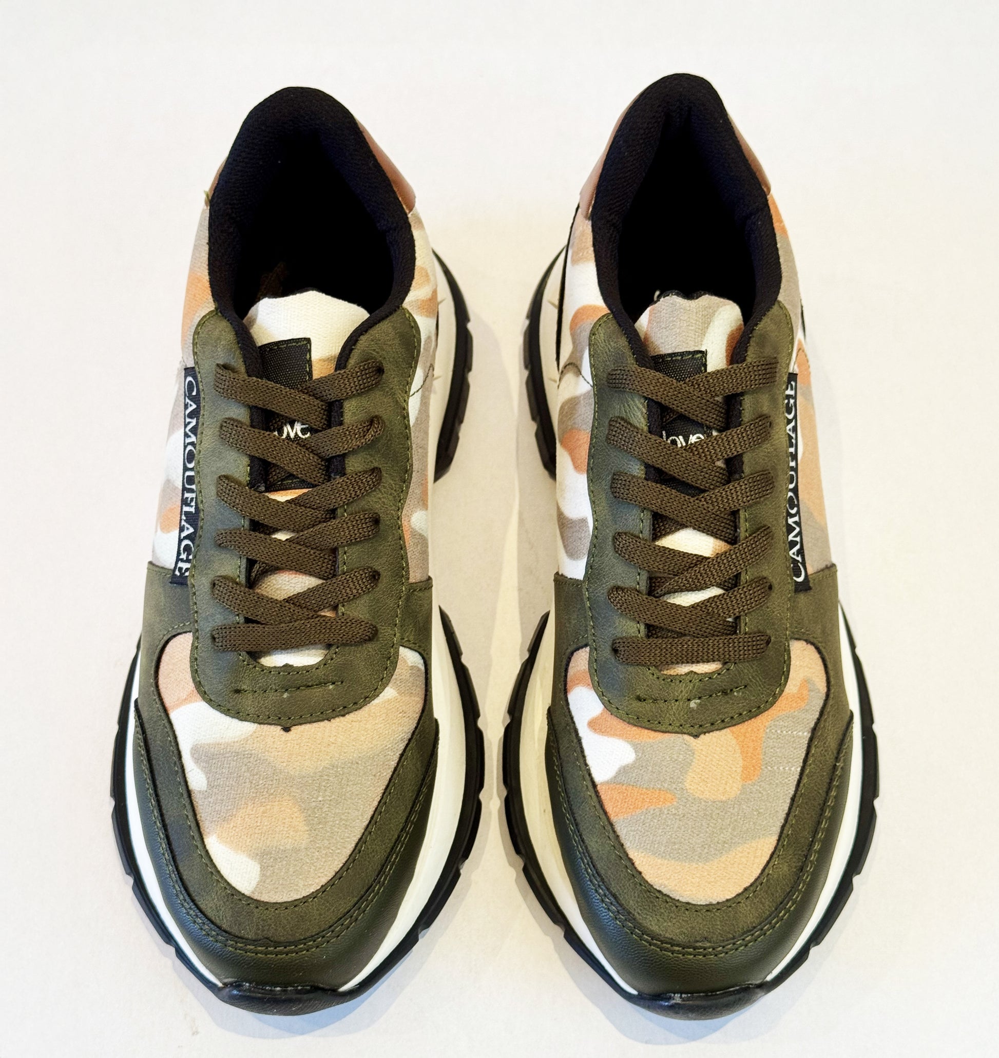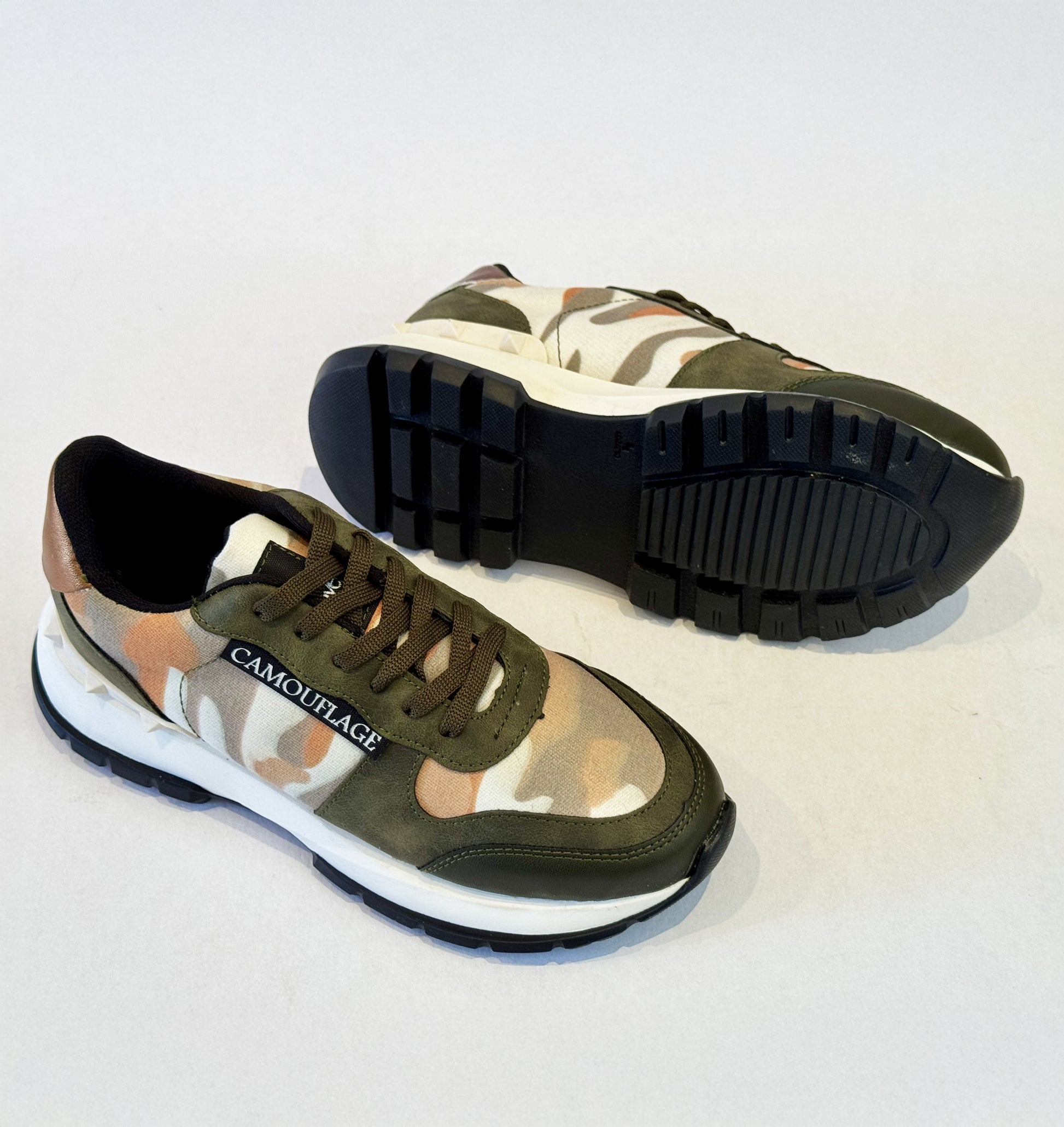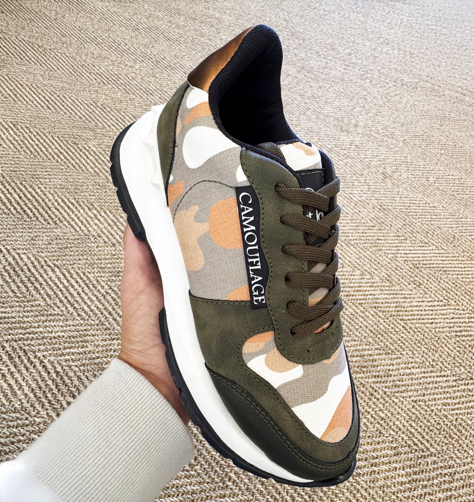Dale un toque chic a tu estilo diario con estos tenis camuflaje en tonos ocres y construcción en olivo con aplicaciones en relieve tono neutro para realzar y definir el estilo. Con un tacón de 3cm, estos zapatos ofrecen una combinación perfecta de comodidad y altura. Su diseño de cuña flat y estampado liso los hace versátiles para cualquier atuendo, mientras que la fijación de agujeta asegura un ajuste perfecto. La punta medio puntal y la textura piel completa el look sofisticado y llamativo de estos tenis.